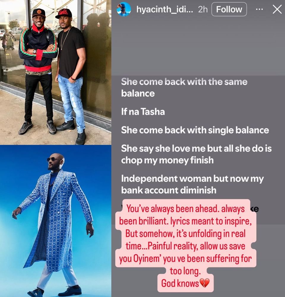 In an Instagram post, Hyacinth reflected on how 2Baba’s life seems to echo the pain expressed in his lyrics. He wrote, “You’ve always been ahead, always been brilliant, lyrics meant to inspire, but somehow, it’s unfolding in real time. Painful reality, allow us save you. Oyinem, you’ve been suffering for too long. God knows.”