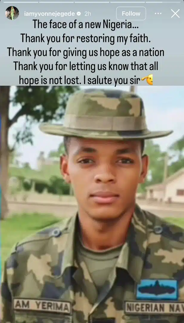 “The face of a new Nigeria… Thank you for restoring my faith. Thank you for giving us hope as a nation. Thank you for letting us know that all hope is not lost. I salute you sir.”