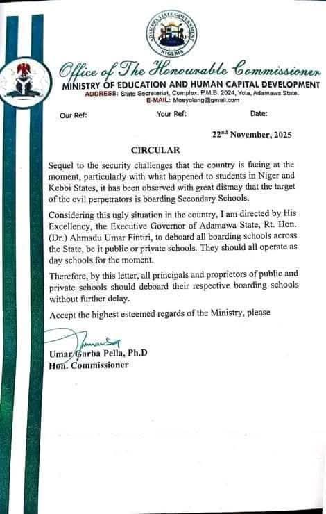 The Adamawa State Government has announced the immediate conversion of all boarding secondary schools to day schools in response to the growing security challenges facing the country.