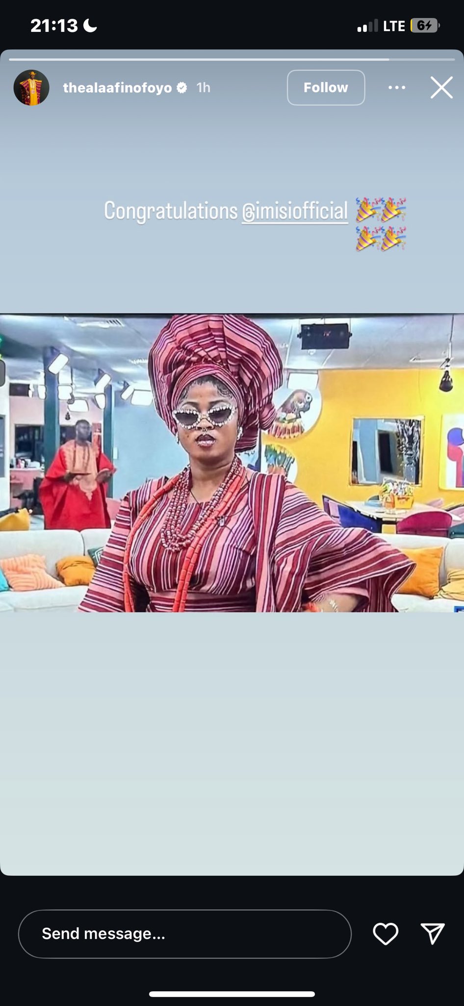 On his official Instagram page, the monarch shared a simple message: “Congratulations @imisiofficial,” recognizing both her achievement and her roots in Oyo State.