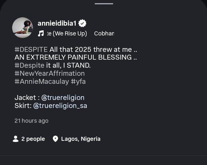The post struck a chord with many, as 2025 marked one of the most difficult chapters of her life. During the year, Annie officially ended her marriage to music icon 2Baba, a union that had long played out in the public eye. The situation drew even more attention after the singer moved on and later married Natasha Osawaru.