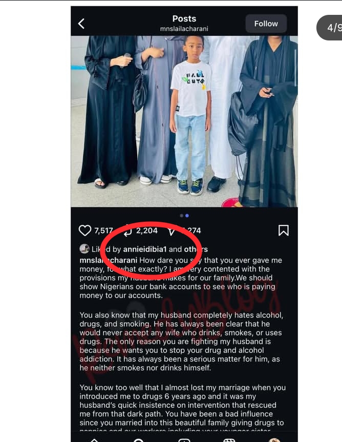 Annie Idibia has attracted criticism after liking an Instagram post by Laila Charani, who accused Regina Daniels of introducing her to drugs years ago and made other serious claims.