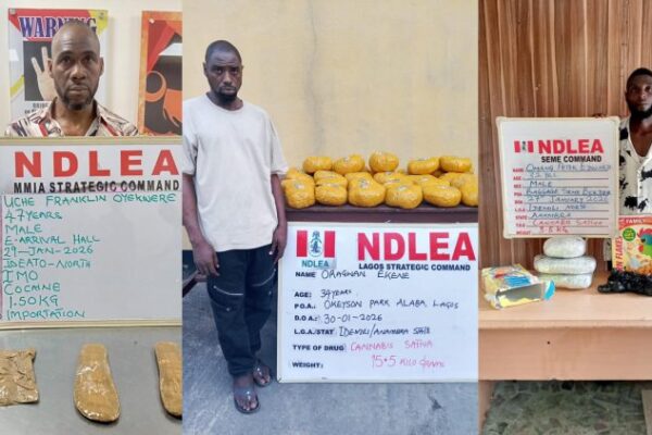 A Brazil based Nigerian businessman Uche Franklin Onyekwere has been arrested by operatives of the National Drug Law Enforcement Agency (NDLEA) at the arrival hall of the Murtala Muhammed International Airport (MMIA) Ikeja-Lagos for concealing parcels of cocaine in his private part and soles of his footwear.   Onyekwere was arrested on Thursday 29th January 2026 during the inward clearance of South African Airways flight passengers arriving from Brazil via Johannesburg following processed intelligence. When the 47-year-old suspect was taken for full body scan, the result confirmed illicit drug concealment.   As a result, he was subjected to a strip search, during which a big parcel of white powdery substance, which later tested positive for cocaine, was discovered wrapped around his right thigh. A further search revealed two additional wraps of the same substance concealed in the sole of a pair of flat shoes worn by the suspect. In all, three large wraps of cocaine, with a gross weight of 1.60 kilograms, were recovered from his body and footwear.   During a preliminary interview, the suspect revealed he purchased the illicit drug consignment in Brazil with the intention to resell the cocaine in Nigeria in order to raise capital to boost his business and also finance the naming ceremony of his newly born child. The suspect who lives in Rua Ever, Mulariuha, São Paulo, claimed that he has been living in Brazil since 2008 while he has been operating a toy business for about nine years.   At the Tincan seaport in Lagos, a total of 55 jumbo bags of Canadian Loud, a strong strain of cannabis with a gross weight of 1,183 kilograms imported from Montreal, Canada in a container was discovered on Wednesday 28th January during a joint examination of the shipment by NDLEA officers, Customs and other security agencies. The illicit consignments were hidden inside two vehicles: a Hyundai SUV and a Toyota Matrix car.   In Niger state, NDLEA operatives acting on credible intelligence in the early hours of Tuesday 26th January intercepted a long truck marked T 31589 LA along Dei-Dei Abuja expressway where they arrested the trio of Andy Chidogu, 49; Kenneth Ogene, 45; and Sadiq Olanrewaju, 27, for conveying 176 bags of skunk, a strain of cannabis weighing 2,735 kilograms and 1 kilogram of Colorado, a synthetic cannabis, concealed in the truck.   Investigations revealed that Kenneth Ogene who drives the truck left Lagos on 23rd January loaded with 800 bags of flour to Ekpoma, Edo State and arrived the following day 24th January. In Ekpoma, he then negotiated to transport the 176 bags of skunk and 1kg Colos for N1.7million.