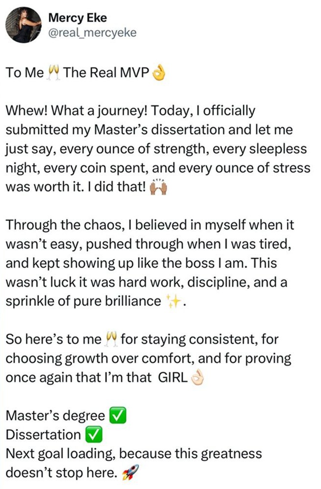 “To me, the real MVP! Whew! What a journey! Today, I officially submitted my Master’s dissertation, and let me just say, every ounce of strength, every sleepless night, every coin spent, and every bit of stress was worth it. I did that!” she wrote.