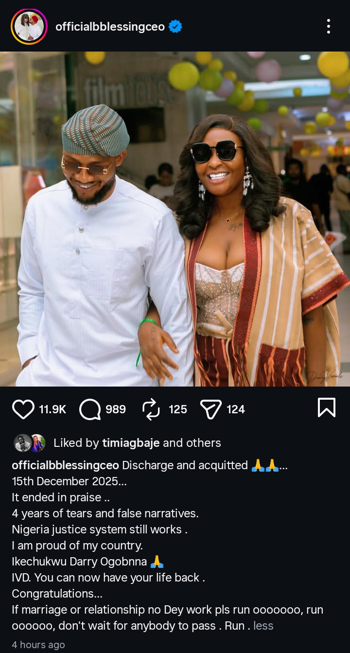 Blessing CEO has celebrated the court’s decision to discharge and acquit Ikechukwu Darry Ogobnna, widely known as IVD, in the case linked to the death of his wife.