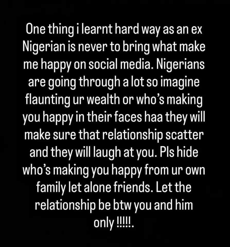Her post underscores the importance of discretion, even around family and friends, urging people to keep the sources of their happiness private to safeguard both their peace and their relationships.