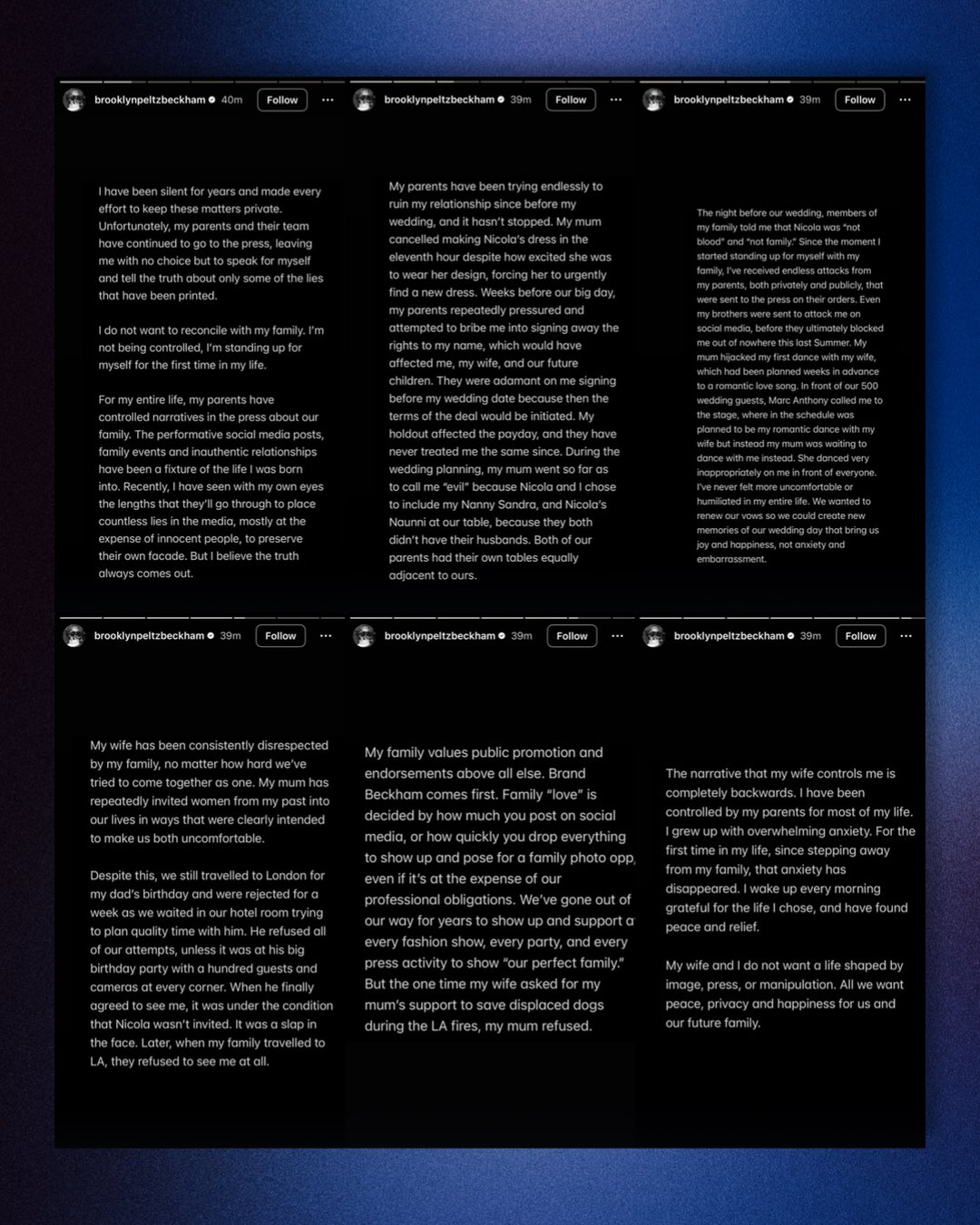 The dispute has reportedly involved his younger brother, Cruz. Last December, Cruz responded to a Daily Mail report claiming Brooklyn had been unfollowed by their parents on social media, stating that the family had all been blocked accidentally. Brooklyn, however, insists that Cruz was used by his parents to target him online.