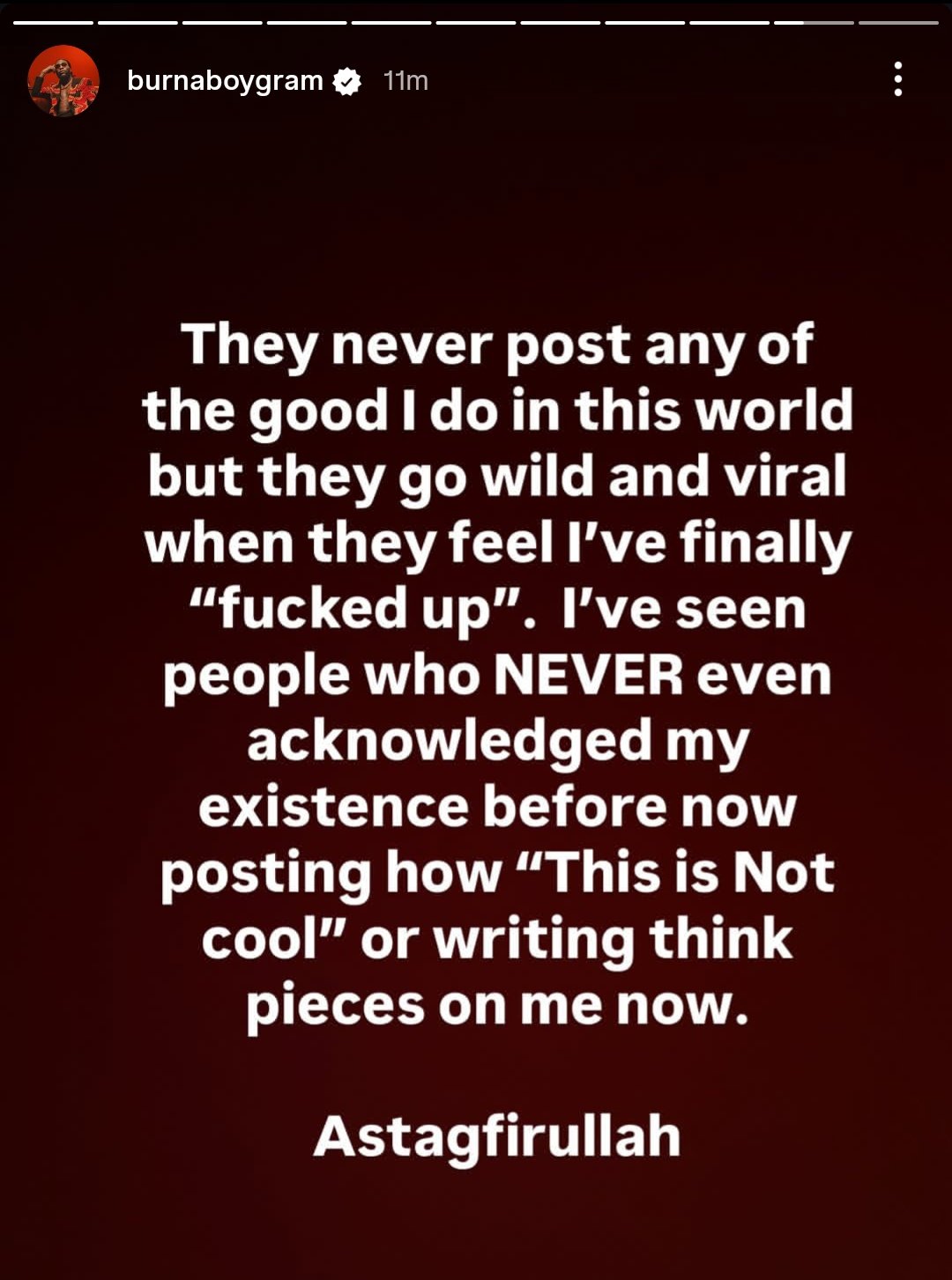 Burna Boy has responded on Instagram after facing backlash for comments he made while addressing a viral incident involving a sleeping couple at one of his concerts.