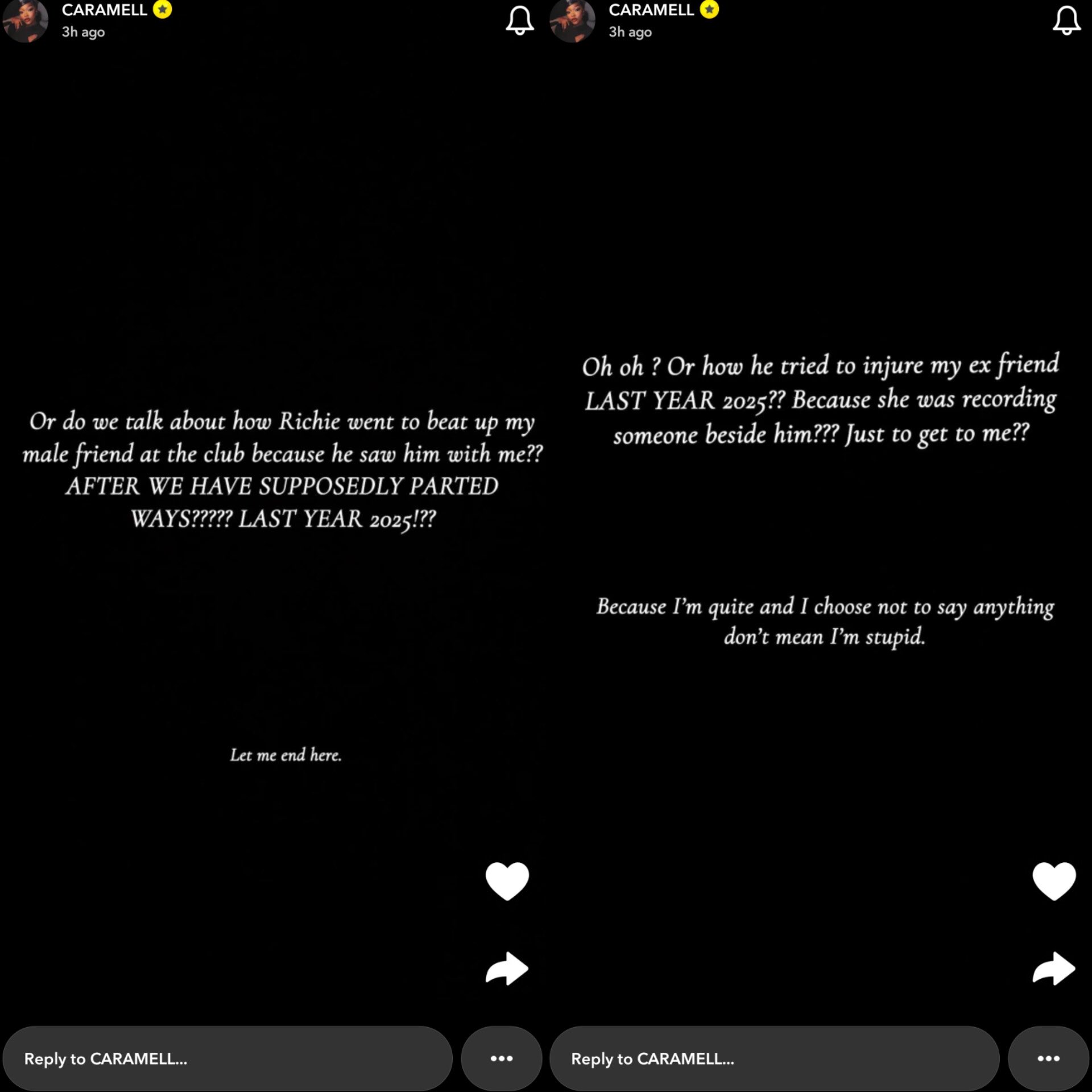 “Or do we talk about how Richie went to beat up my male friend at the club because he saw him with me?? AFTER WE HAVE SUPPOSEDLY PARTED WAYS????? LAST YEAR 2025!??
