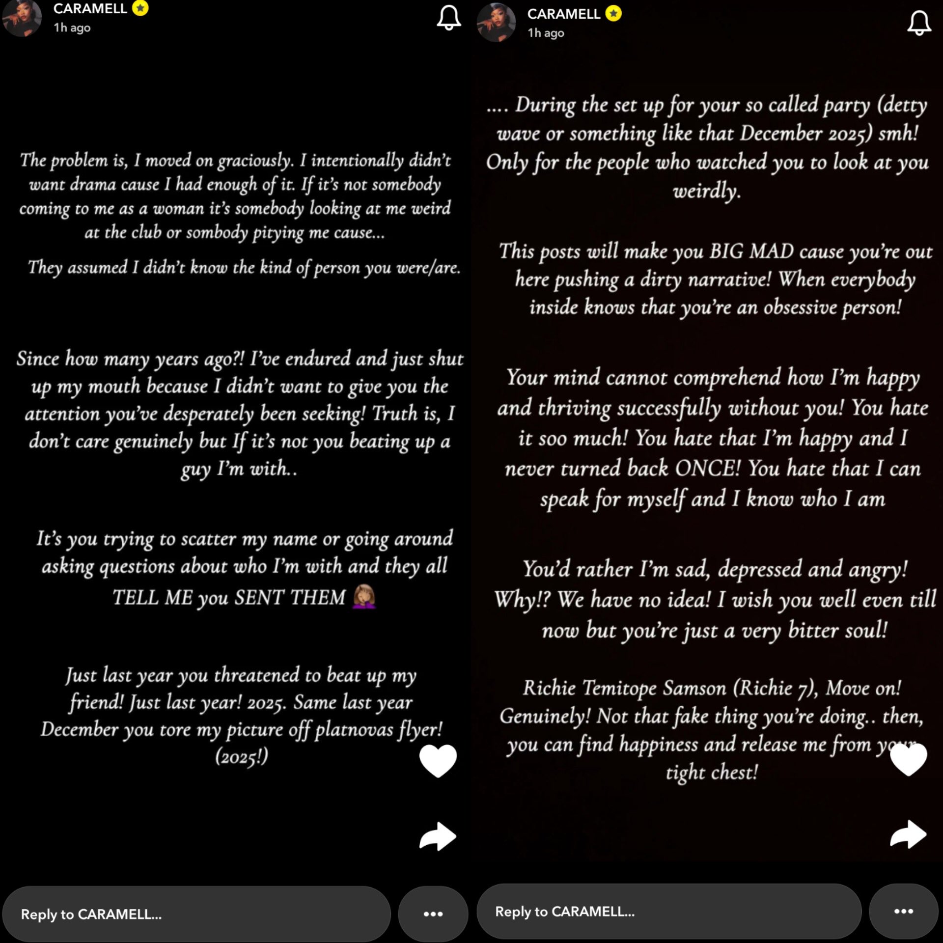 “Richie Temitope Samson (Richie 7), Move on! Genuinely! Not that fake thing you’re doing.. then, you can find happiness and release me from yo tight chest!”