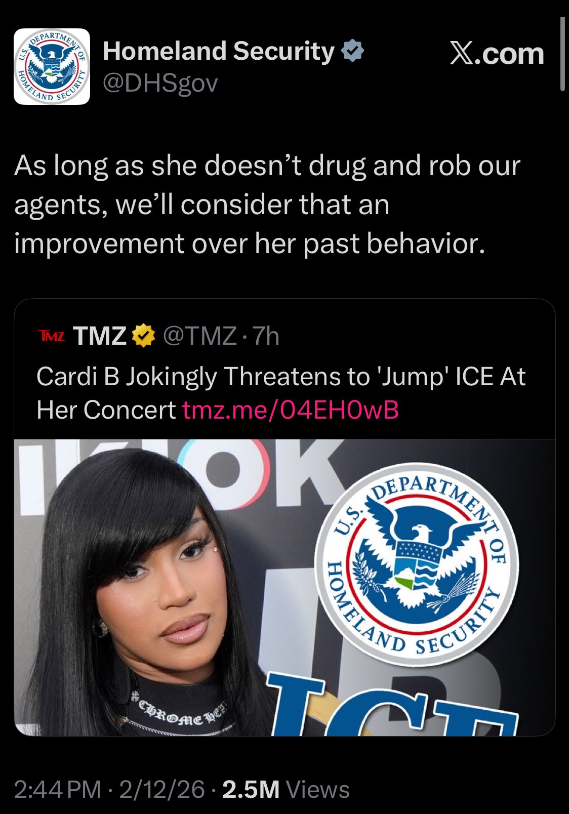 In response, DHS posted on X (formerly Twitter), taking a jab at her history: “As long as she doesn’t drug and rob our agents, we’ll consider that an improvement over her past behavior.” This referred to an old video in which Cardi B admitted to drugging and robbing men during her time as a stripper. She later clarified, “Whether or not they were poor choices at the time, I did what I had to do to survive. I never claimed to be perfect or come from a perfect world.”