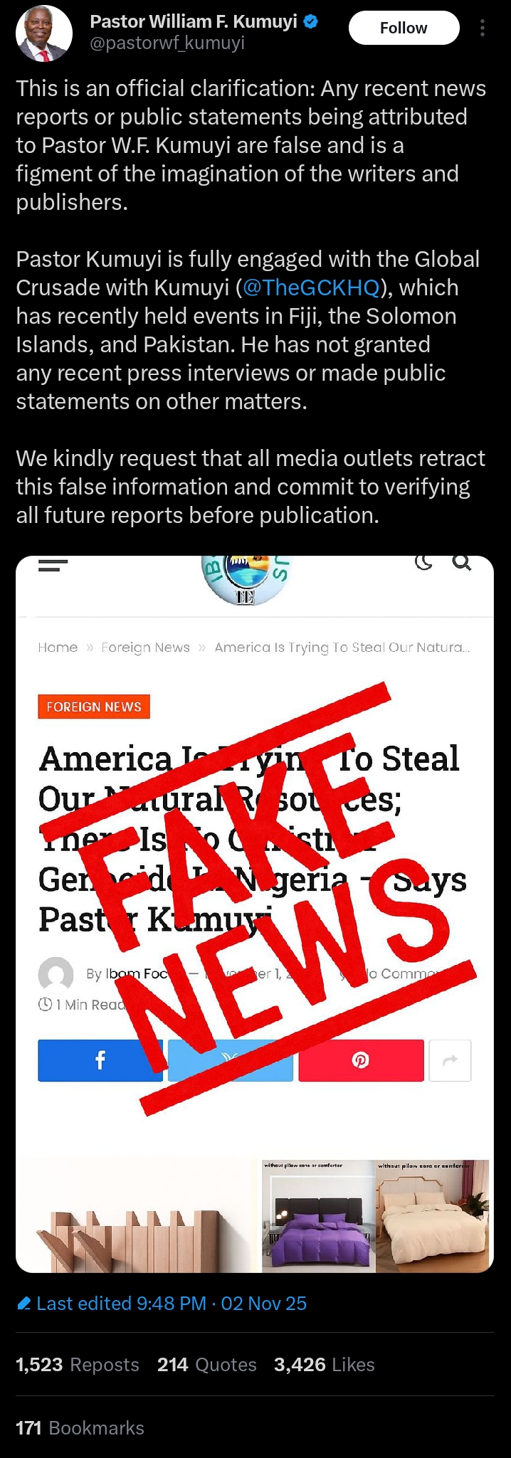 The story with the headline: “America is Trying to Steal our Natural Resources; There is No Christian Genocide in Nigeria, says Pastor Kumuyi” is a total fabrication and the figment of the imagination of its authors.