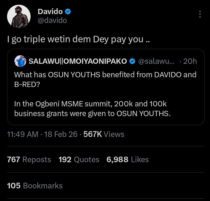 A political enthusiast then challenged Davido and his cousin B‑Red, asking: “What has OSUN YOUTHS benefited from DAVIDO and B‑RED? In the Ogbeni MSME summit, 200k and 100k business grants were given to OSUN YOUTHS.”