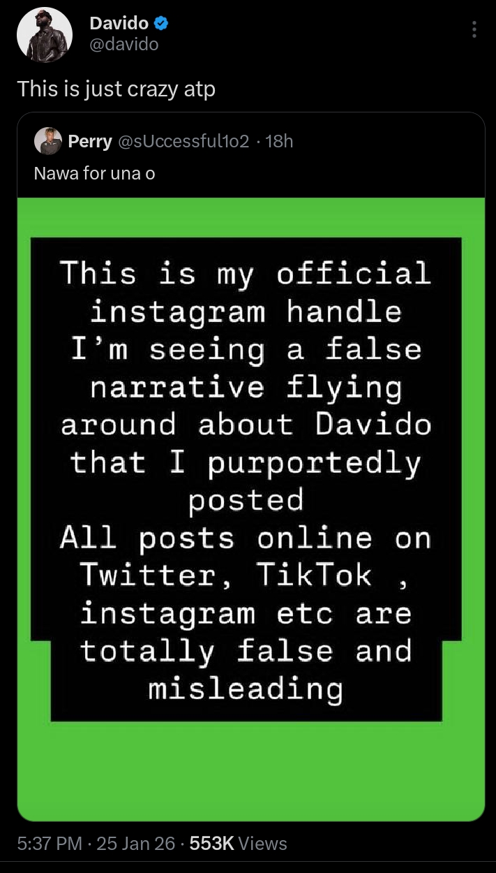 “This is my official Instagram handle. I’m seeing a false narrative flying around about Davido that I purportedly posted. All posts online, on Twitter, TikTok, Instagram are totally false and misleading,” she stated.