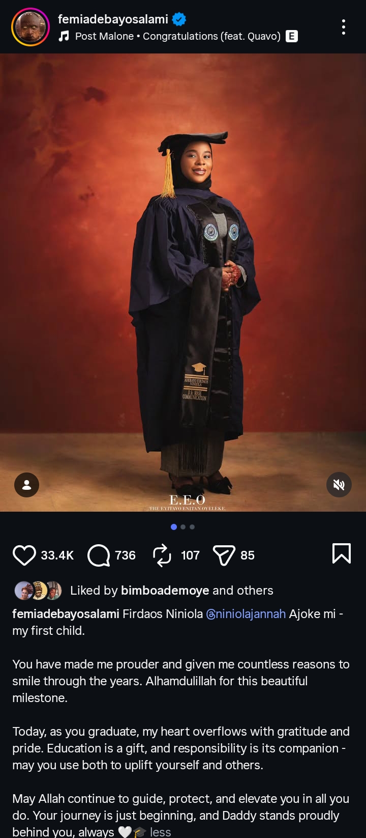 He wrote, “Firdaos Niniola #niniolajannah Ajoke mi – my first child. You have brought me endless reasons to smile over the years. Alhamdulillah for this wonderful achievement. Today, you graduate, and my heart is full of gratitude and pride. Education is a gift, and responsibility is its companion – may you use both to uplift yourself and others.”