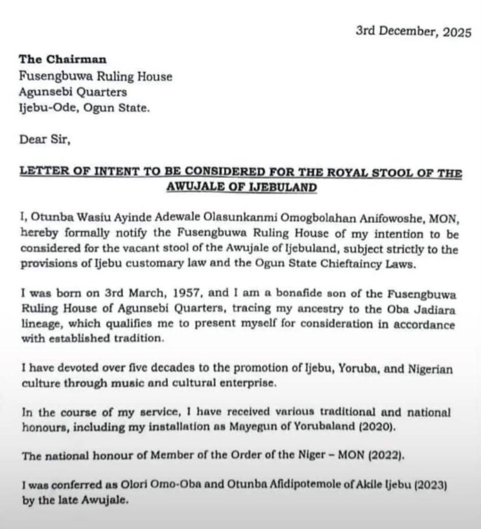 In a letter dated 3 December 2025 and addressed to the Chairman of the Fusengbuwa Ruling House in Agunsebi Quarters, Ijebu-Ode, Ayinde, who holds the national honour of Member of the Order of the Niger (MON), stated that his candidacy is guided strictly by Ijebu customary law and Ogun State Chieftaincy Laws.