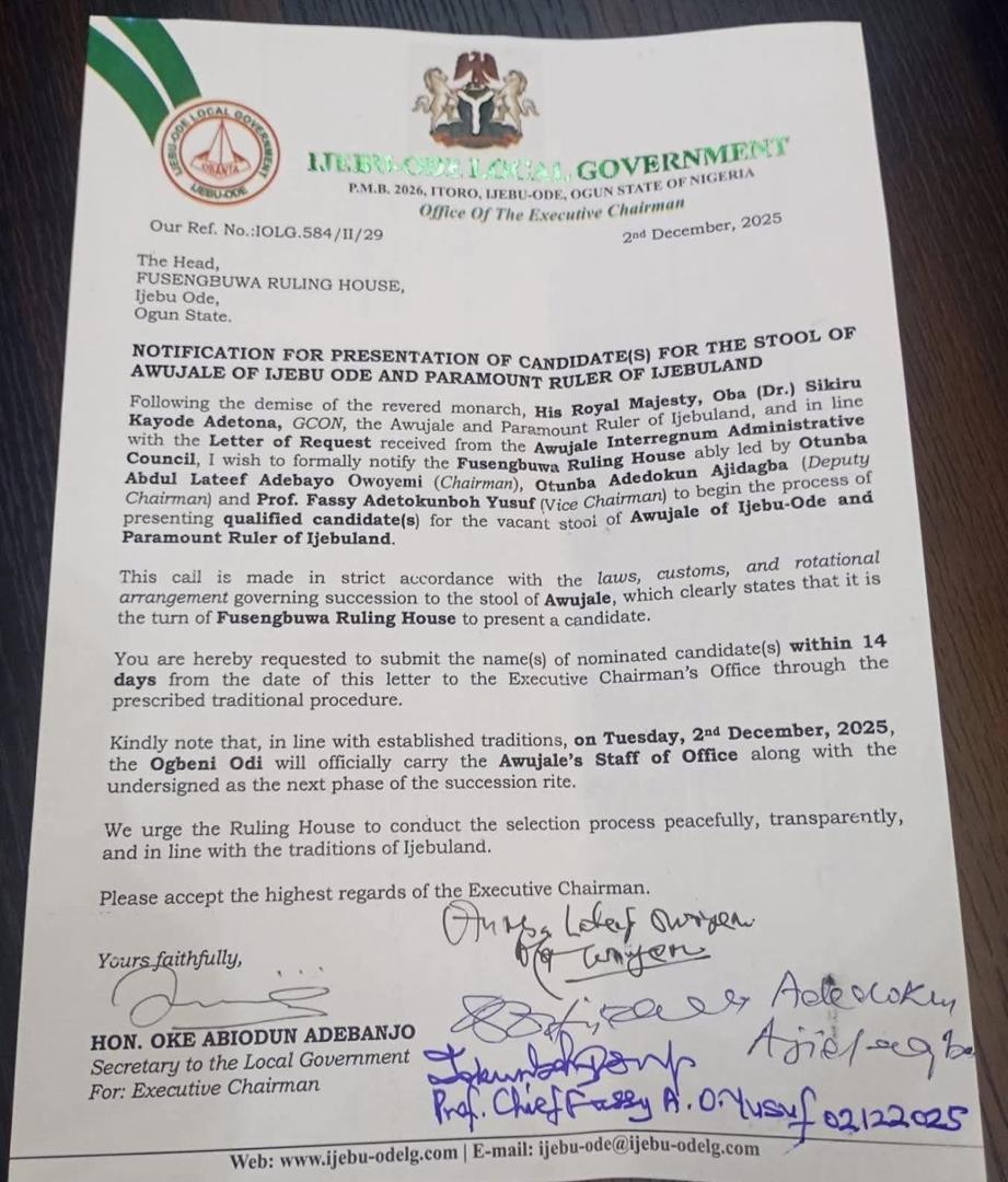 The ruling house leadership, including Chairman Otunba Abdul-Lateef Adebayo Owoyemi, Deputy Chairman Otunba Adedokun Ajidagba, and Vice Chairman Prof. Fassy Adetokunbo Yusuf, has been asked to submit nominated candidates within 14 days. An important ritual is scheduled for Tuesday, 2 December 2025, when the Ogbeni Odi will officially carry the Awujale’s Staff of Office, marking the start of the next phase in the succession process.