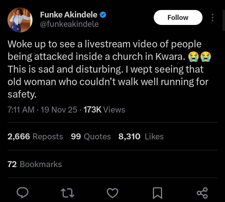 Nigerian entertainers have expressed outrage following the recent attack on a church in Kwara State, where bandits killed worshippers and abducted several others. Funke Akindele, Falz, AY the Comedian, and Mr. Macaroni took to social media to condemn the violence and call on the government to take urgent action.