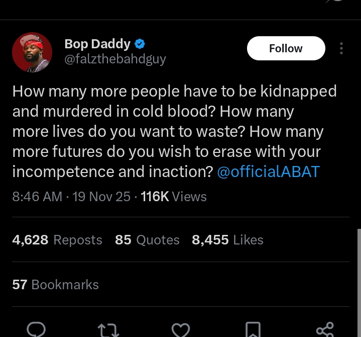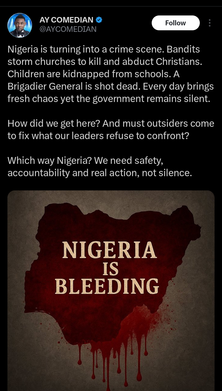 “Nigeria is turning into a crime scene. Bandits storm churches to kill and abduct Christians. Children are kidnapped from schools. A Brigadier General is shot dead. Every day brings fresh chaos yet the government remains silent. How did we get here? Must outsiders come to fix what our leaders refuse to confront? We need safety, accountability, and real action, not silence.”