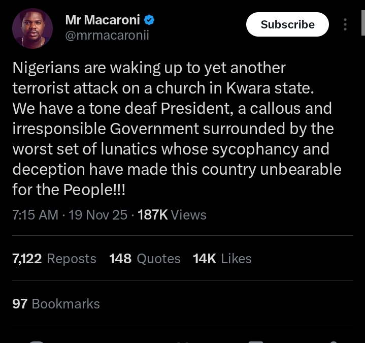 “Nigerians are waking up to yet another terrorist attack on a church in Kwara State. We have a tone‑deaf President, a callous and irresponsible government surrounded by the worst set of sycophants whose deception has made this country unbearable for the people!”