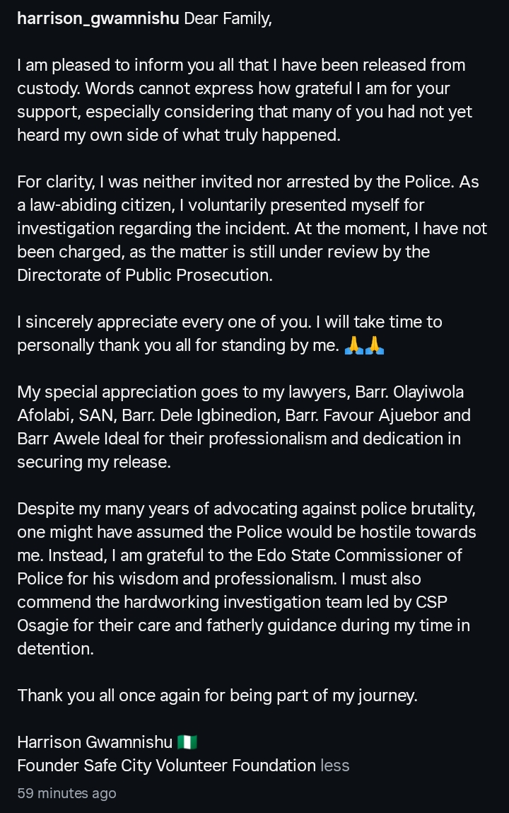 Rights activist Harrison Gwamnishu has spoken out following his release from police custody, clarifying that he voluntarily presented himself for investigation and has not been charged. In a heartfelt message, he expressed gratitude to supporters, commended the police for their professionalism, and thanked his legal team for their dedication.
