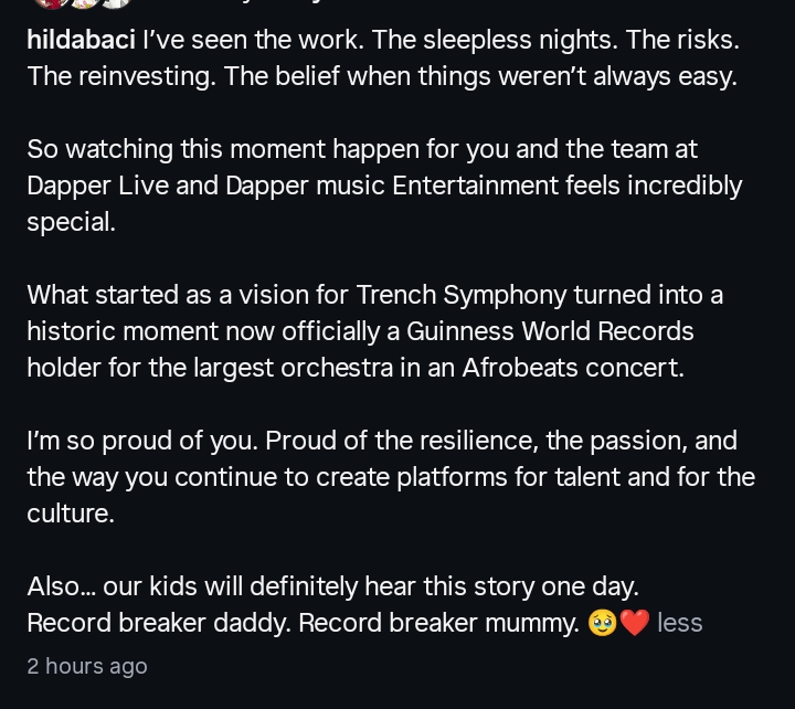Celebrity chef and Guinness World Record holder Hilda Baci has praised her fiancé, music executive Damilola “Dapson” Akinwunmi, following his historic achievement at the “Trench Symphony: The Dapper Live Experience” in Lagos.
