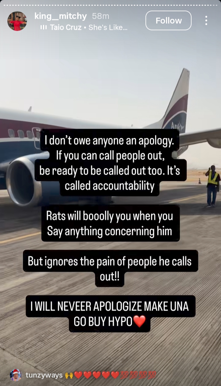 “I don’t owe anyone an apology. If you can call people out, be ready to be called out too. It’s called accountability – Rats will booolly you when you say anything concerning him but ignores the pain of people he calls out!! I WILL NEVEER APOLOGIZE MAKE UNA GOBUY HYPO,” she stated.