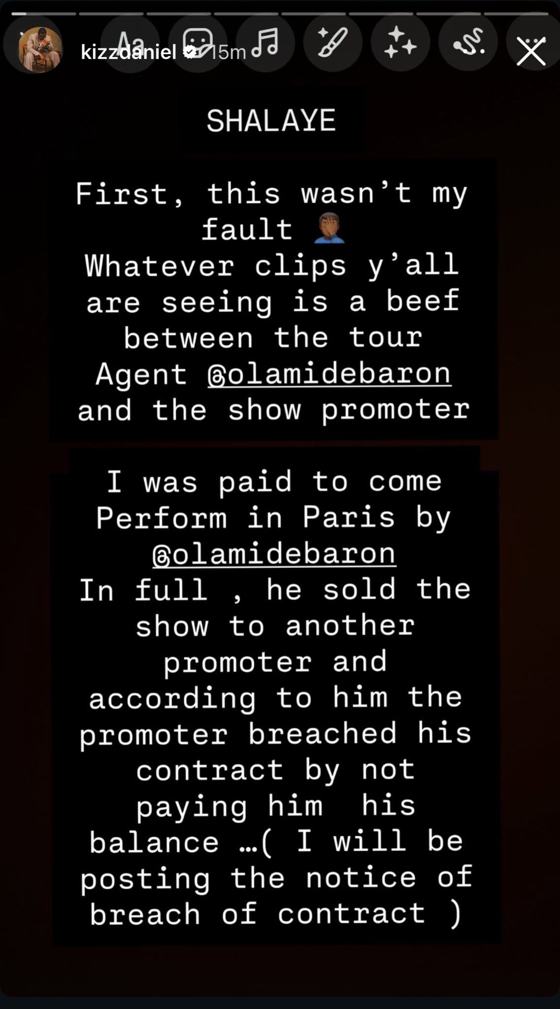 “FSHALAYE. First, this wasn’t my fault. Whatever clips you’re seeing is a dispute between my tour agent @olamidebaron and the show promoter. I was paid in full by @olamidebaron to perform in Paris. He sold the show to another promoter, who allegedly breached the contract by not paying the balance. I will be posting the notice of breach of contract.”