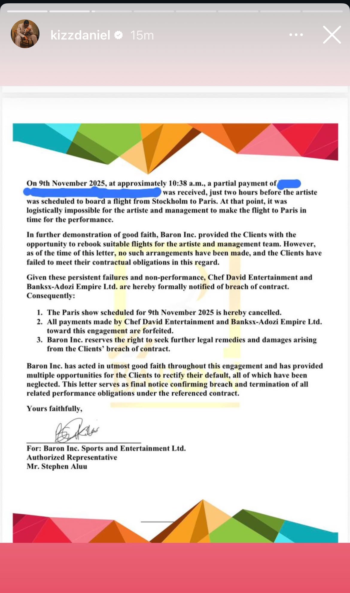 Kizz Daniel also shared official letters from Baron’s company confirming the cancellation of the show. In further posts, he provided a detailed account of the logistical issues that prevented him from performing.