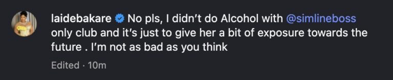 In a follow-up post, she added, “No please, I didn’t do alcohol with @simlineboss, only club, and it’s just to give her a bit of exposure towards the future. I’m not as bad as you think.”