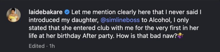 “Let me mention clearly here that I never said I introduced my daughter, @simlineboss, to alcohol. I only stated that she entered a club with me for the very first time in her life at her birthday afterparty. How is that bad naw?” she wrote.