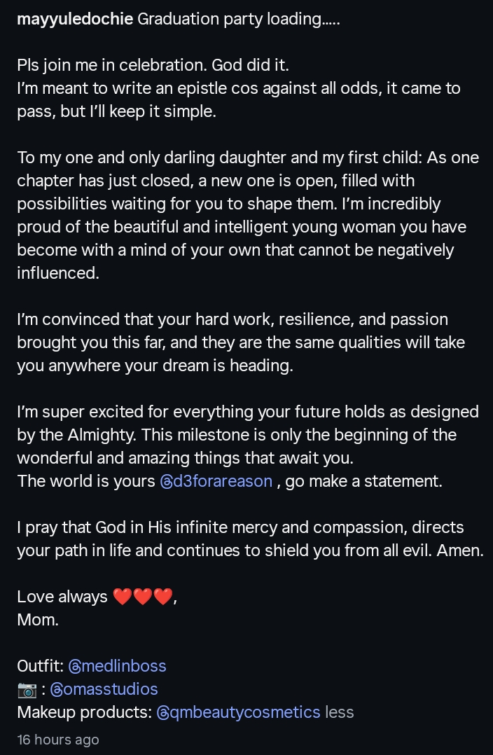 In her touching tribute, May spoke directly to her daughter, her first and only child, reflecting on the milestone and the journey ahead. She praised her for her intelligence, independence, and resilience, describing her as a young woman whose determination and hard work have carried her this far.