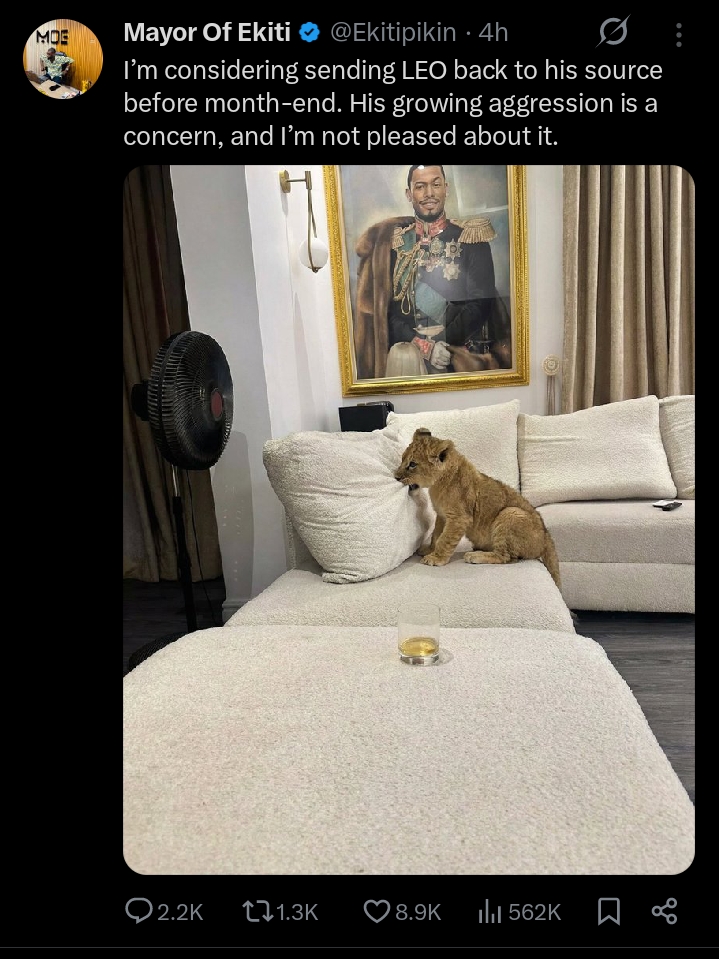 Mayor Of Ekiti, a popular influencer on X, has hinted at returning his pet lion cub, Leo, to the zoo following concerns about the animal’s increasingly aggressive behaviour.