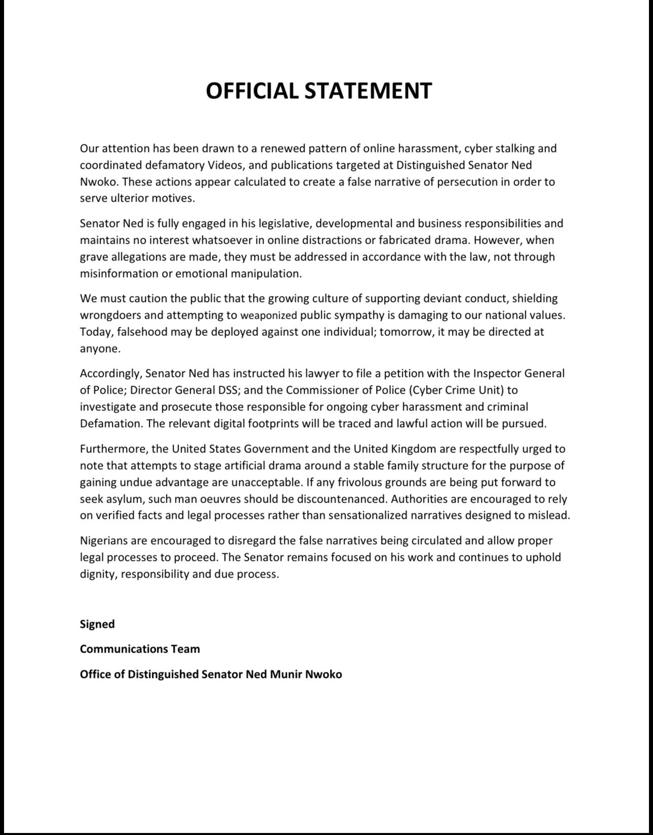 “Our attention has been drawn to a renewed pattern of online harassment, cyber stalking and coordinated defamatory videos and publications targeted at Distinguished Senator Ned Nwoko. These actions appear calculated to create a false narrative of persecution in order to serve ulterior motives.”