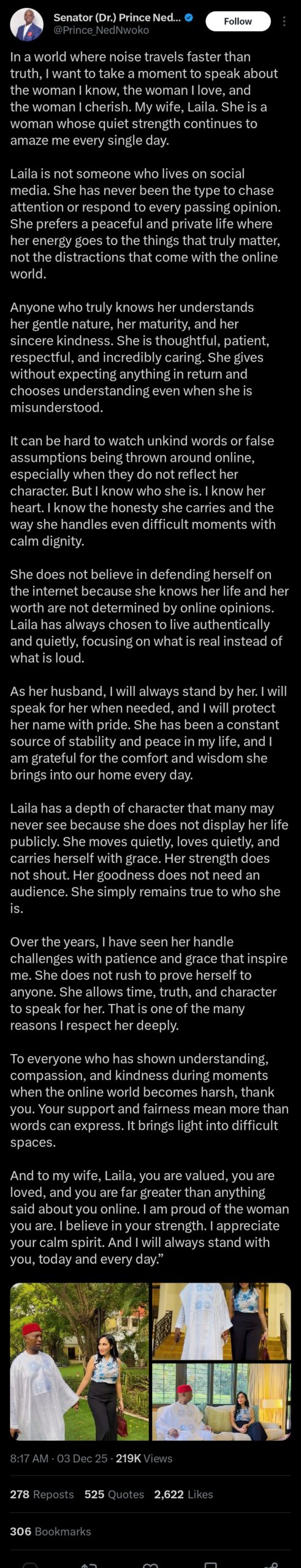 The post offers insight into Nwoko’s admiration for Laila as the couple faces public scrutiny, highlighting the depth of his commitment amid family tensions.