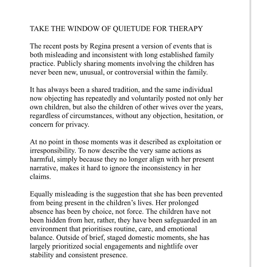 He cautioned that continued public commentary could further complicate the situation, warning that such actions risk “using the children as emotional shields to deflect from unresolved personal issues.”