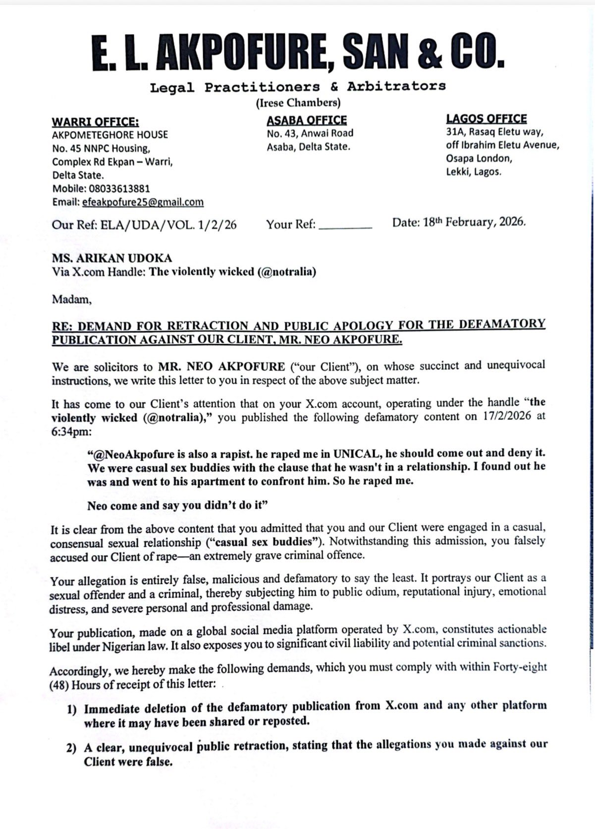 In response, Neo’s lawyers issued a strongly worded letter titled “Demand for Retraction and Public Apology for the Defamatory Publication Against Our Client, Mr. Neo Akpofure.”