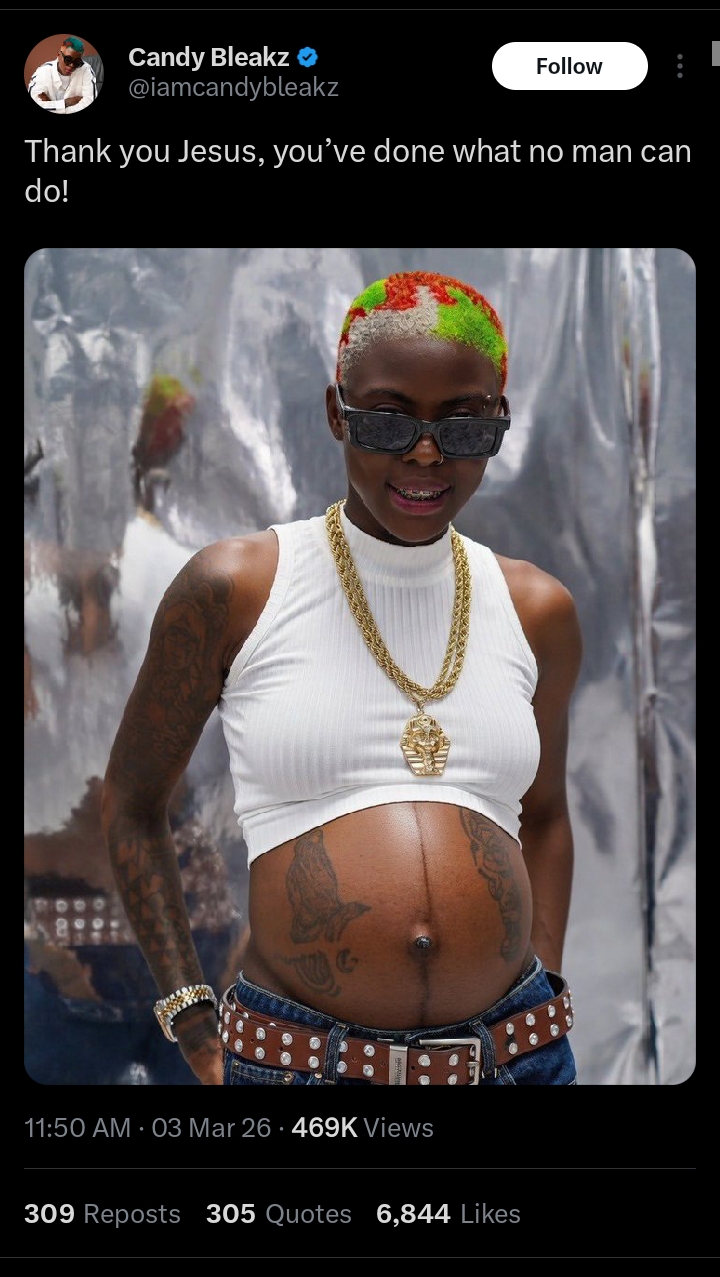 The singer, whose real name is Akiode Blessing Mariam, shared a photo on her X page proudly displaying her baby bump. She expressed her gratitude in the caption, writing, “Thank you Jesus, you’ve done what no man can do!”