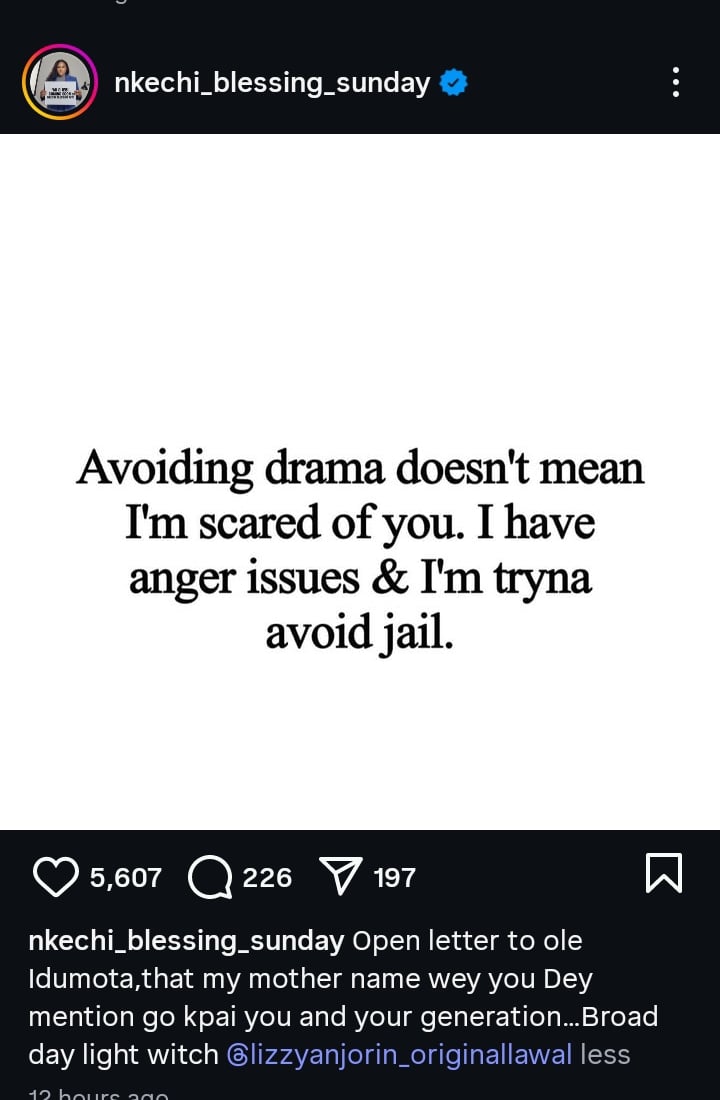 Nkechi also delivered a sharp warning regarding her late mother, telling Lizzy to never mention her name again: “Open letter to ole Idumota, that my mother name wey you Dey mention go kpai you and your generation…Broad daylight witch @lizzyanjorin_originallawal.” She added, “If I ever hear my late’s mum’s name in your mouth again, I will beat you blue black.”