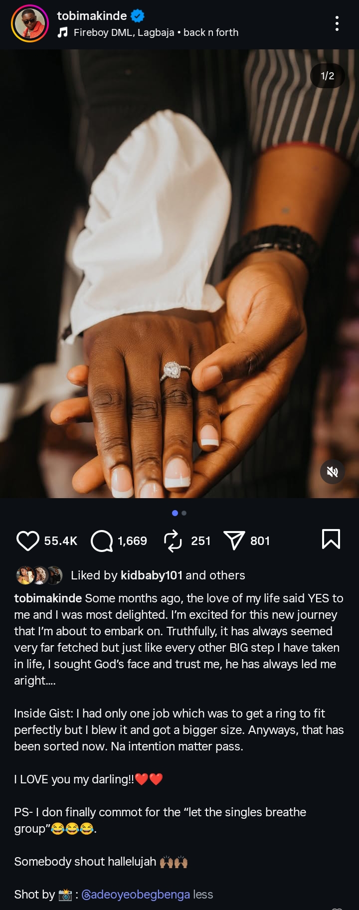 Nollywood actor Tobi Makinde is set to tie the knot! He shared the exciting news on Instagram, expressing his joy and gratitude over the engagement.