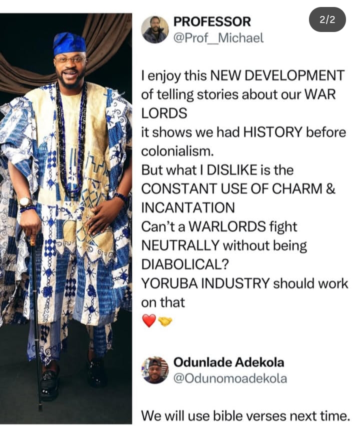 The fan had commended the new epic, War Lord (Olori Ogun), for showcasing the courage and exploits of pre-colonial Yoruba war lords but expressed concern over the constant depiction of supernatural elements. The fan wrote: “What I DISLIKE is the CONSTANT USE OF CHARM & INCANTATION … Can’t a WARLORD fight NEUTRALLY without being DIABOLICAL? YORUBA INDUSTRY should work on that.”