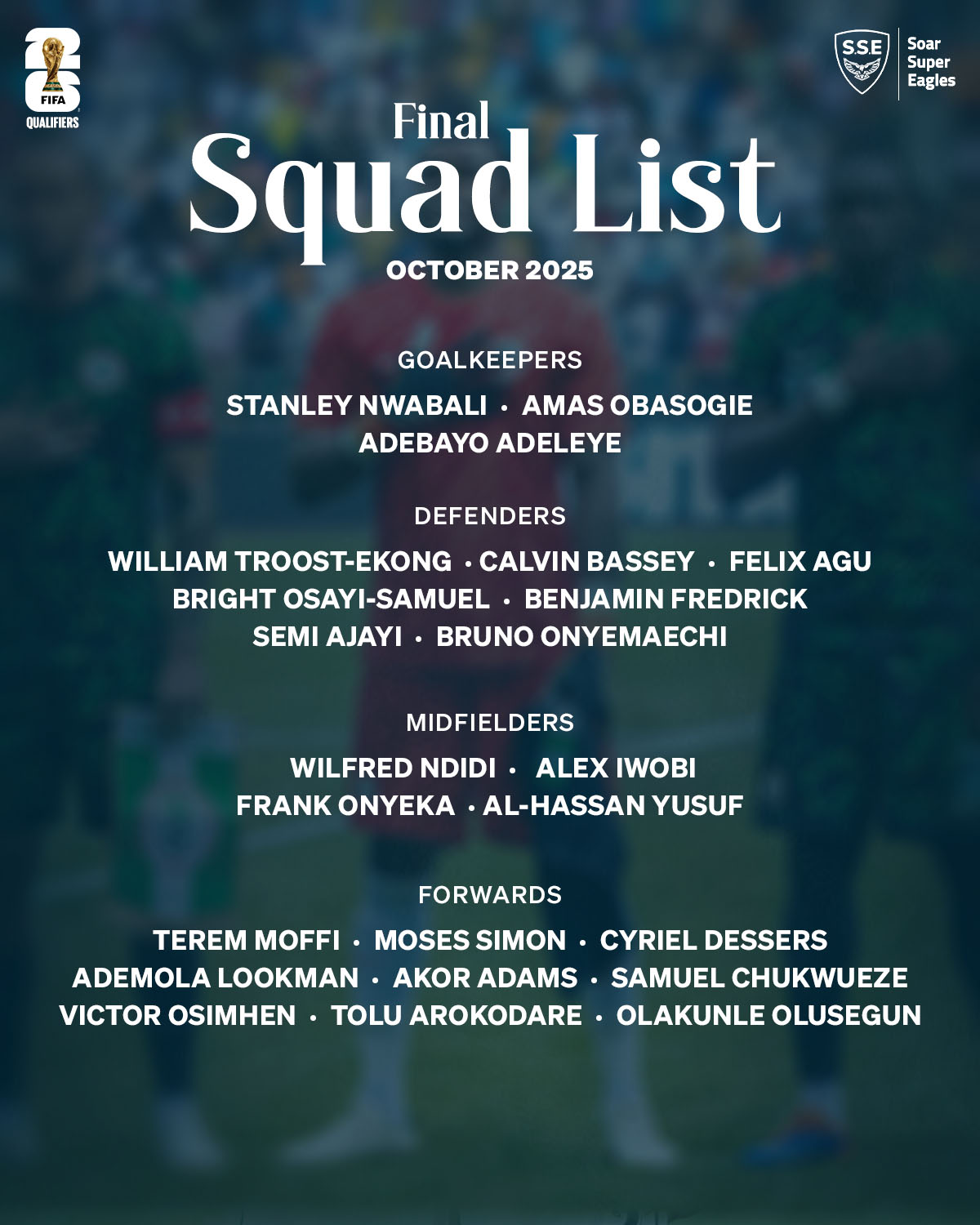 The squad also features captain William Troost-Ekong, Atalanta forward Ademola Lookman, and Tolu Arokodare. Terem Moffi, Semi Ajayi, Alhassan Yusuf, and Olakunle Olusegun return to the fold, while Sevilla striker Akor Adams has earned his first senior call-up.