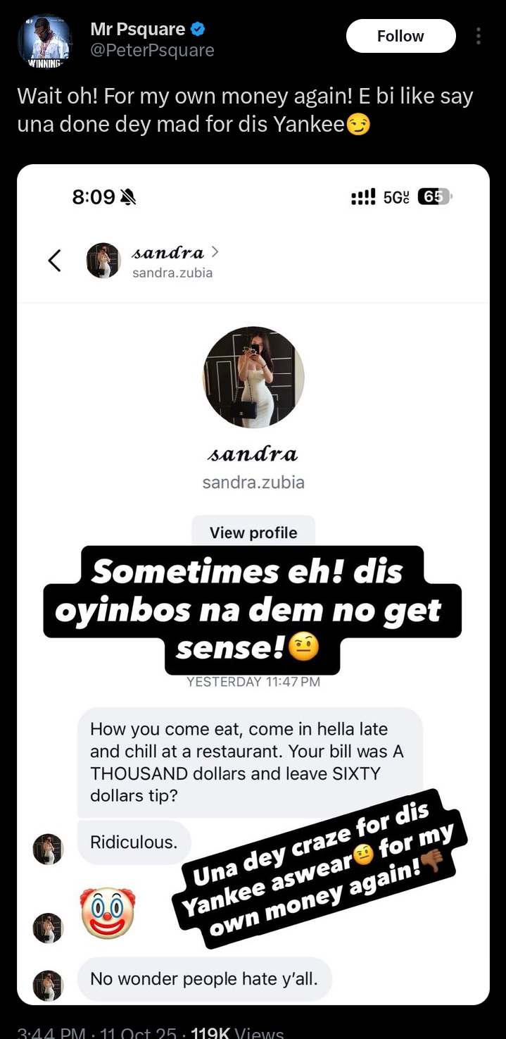 Nigerian music star Peter Okoye, popularly known as Mr P, has called out a foreign woman who criticized him over the amount he tipped at a restaurant in the United States.