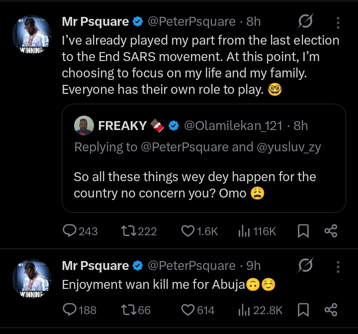 Singer Peter Okoye has addressed criticism from a social media user who questioned why he has not been speaking out about the challenges currently facing Nigeria.