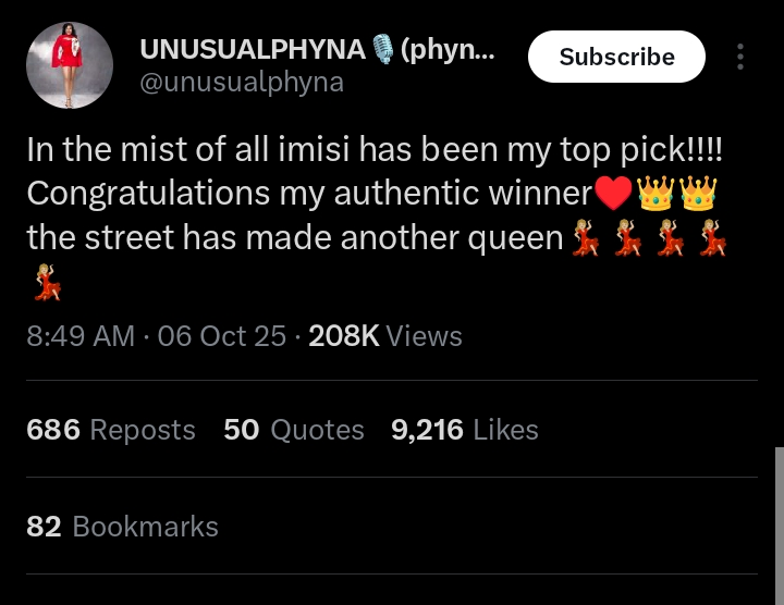 “In the midst of all, Imisi has been my top pick! Congratulations, my authentic winner. The street has made another queen,” she wrote, adding several heart and dancing emojis.