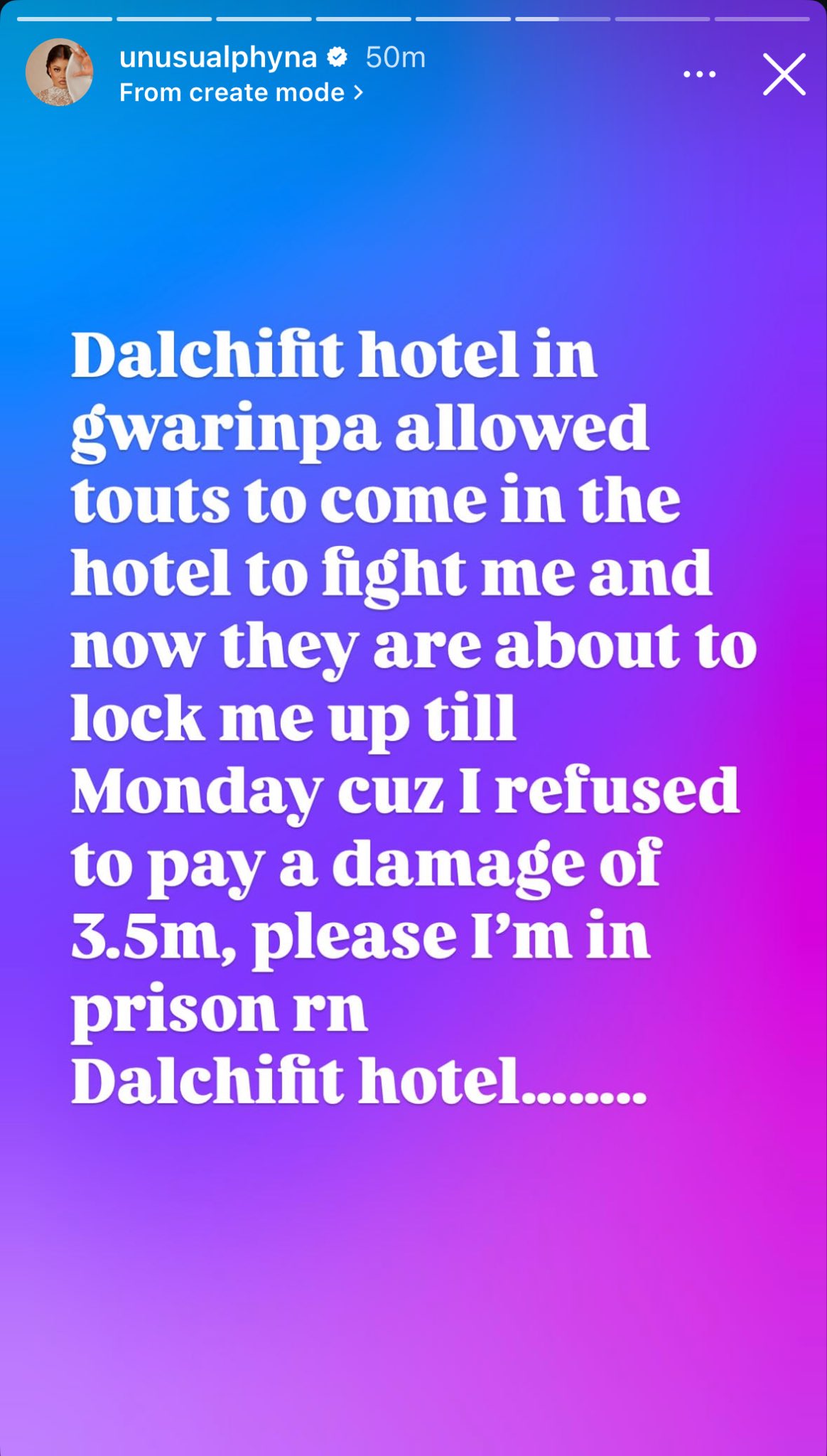 “Dalchifit Hotel in Gwarinpa allowed touts to come into the hotel to fight me, and now they are about to lock me up till Monday because I refused to pay a damage fee of N3.5m. Please, I’m in prison right now,” she wrote.