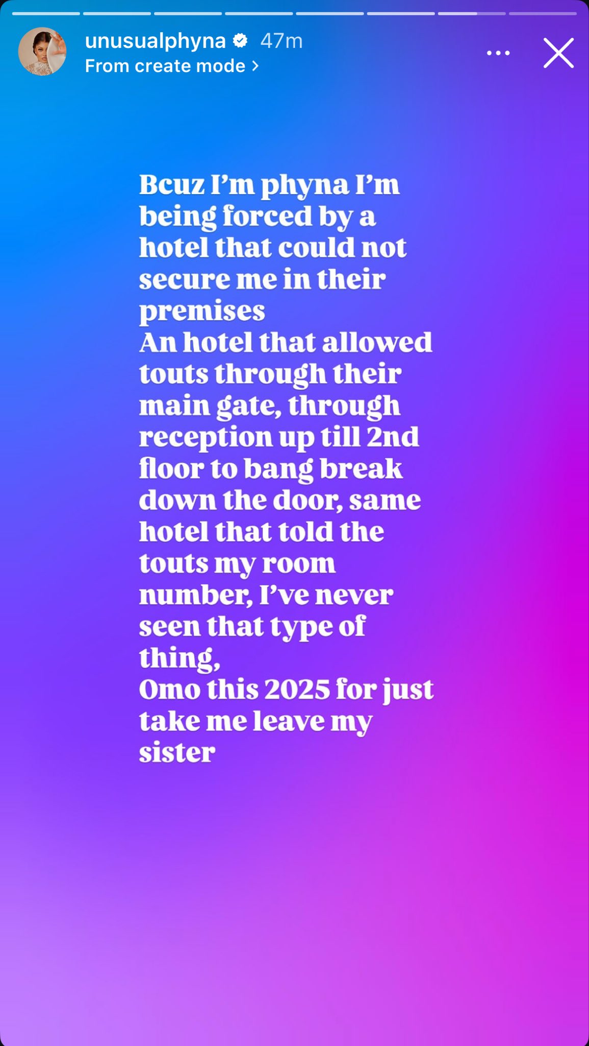 “Because I’m Phyna, I’m being forced by a hotel that couldn’t secure me. A hotel that allowed touts through their main gate, reception, and up to the second floor to break my door. The same hotel that told them my room number — I’ve never seen such a thing,” she lamented.