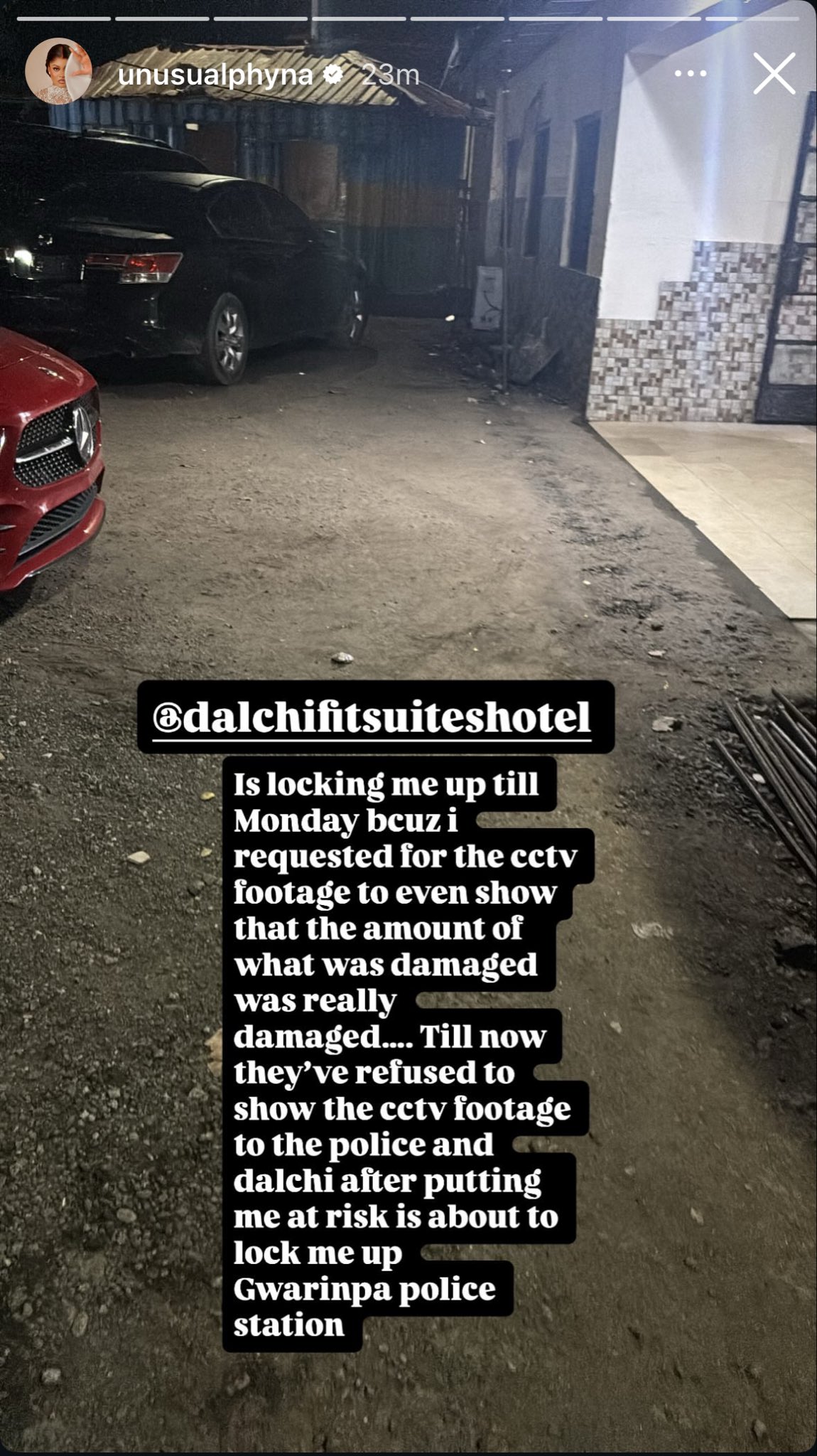 “@dalchifitsuiteshotel is locking me up till Monday because I requested the CCTV footage to confirm the supposed damage. Till now, they’ve refused to show it to the police, and after putting me at risk, they are about to lock me up at Gwarinpa Police Station,” she alleged.