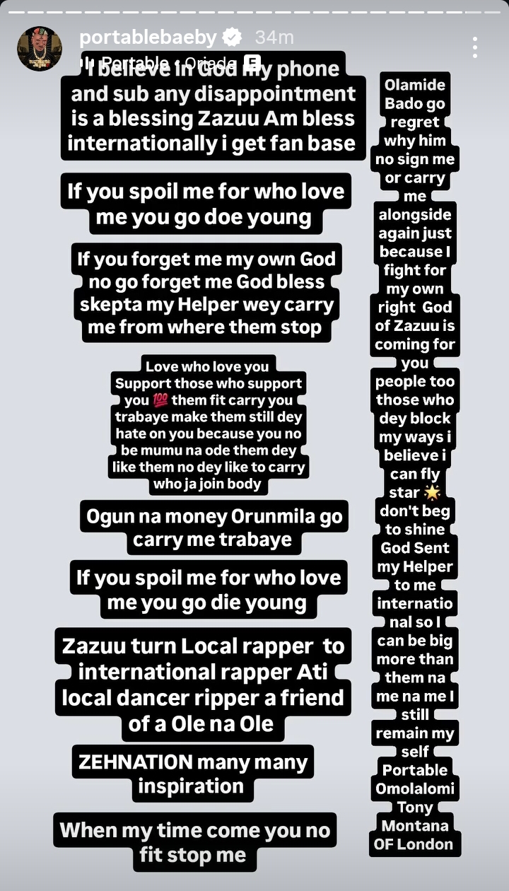 Olamide Bado go regret why him no sign me or carry me alongside again just because I fight for my own right God of Zazuuis coming for you people too those who dey block my ways i believe i can fly star. don’t beg to shine God Sent my Helper tome internatio nalsol can be big more than them na me name! still remain my self Portable Omolalomi Tony Montana OF London”