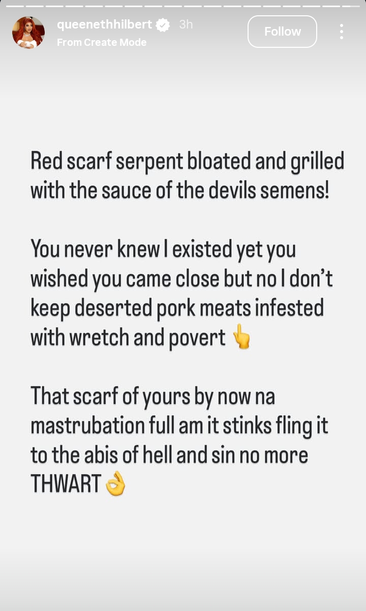 On her Instagram story, Hilbert responded with sharp and provocative language, writing: